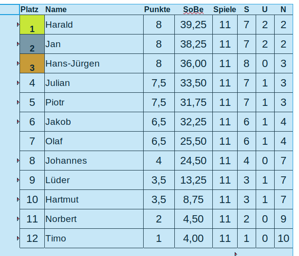 Nach 11 Runden lagen sowohl Hans-Jürgen Klages, Jan Dopmann und Harald Palmer mit jeweils 8 Punkten in Führung, so dass über den Turniersieg die Sonneborn-Berger Wertung entscheiden musste. Hier hatte Harald mit 39,25 Punkten knapp die Nase vorn vor Jan (38,25) und Hans-Jürgen (36,0).